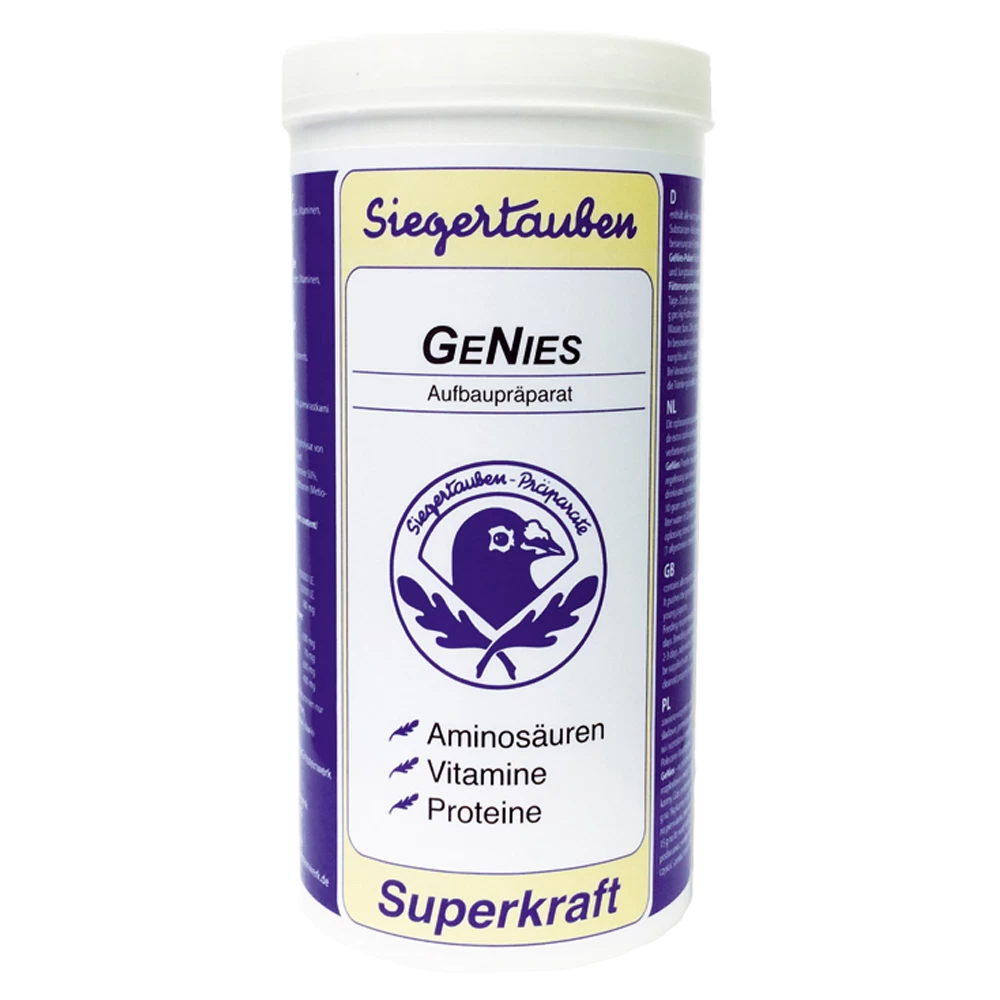 Das Aufbau-Präparat GeNies-Pulver enthält alle wichtigen essentielle Aminosäuren und führt durch den Zusatz stoffwechselaktiver Substanzen, Vitamine und Spurenelemente zur Aufwertung des Körnerfutters und zur Verbesserung der Futterverwertung. GeNies – Pulver fördert die positive Entwicklung der Jungtauben und wird deshalb den Zucht- und Jungtauben regelmäßig gegeben. Es kann sowohl über das Futter als auch über das Trinkwasser verabreicht werden.