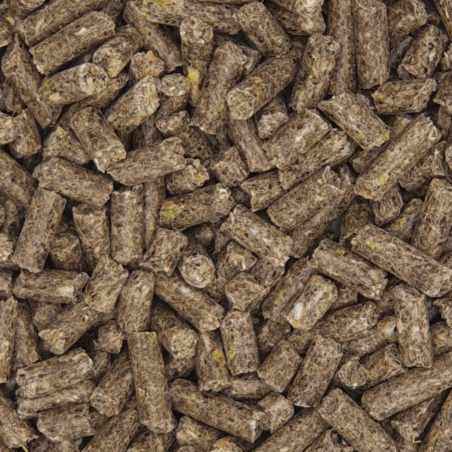 Das Futter kann mit Raufutter wie Gras oder Luzerne ergänzt werden. Die 5 mm Körnerform sorgt für eine rasche Aufnahme und weniger Futterverlust.